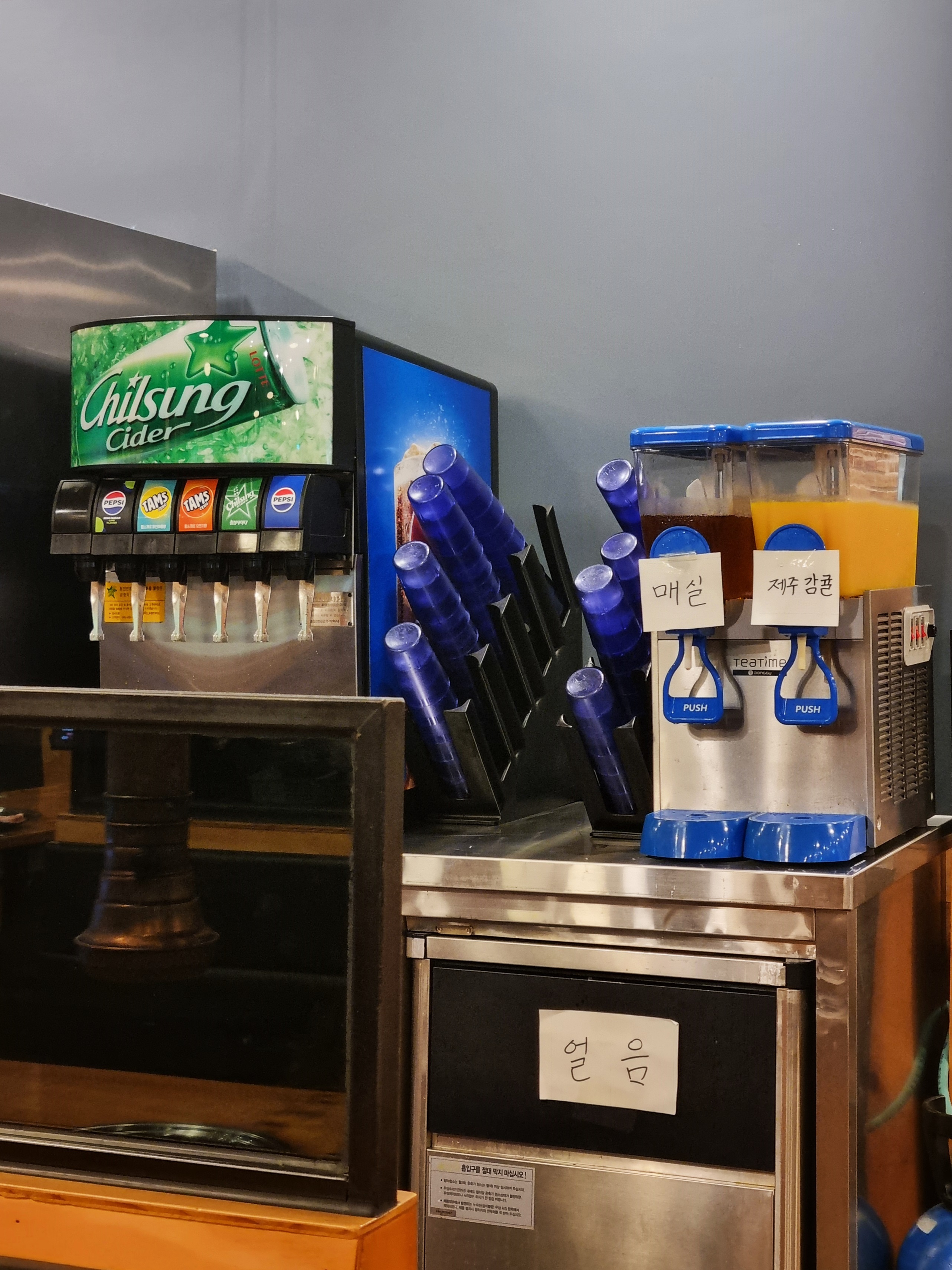 성서 이곡동 맛집 ‘육돈 본점’은 탄산음료뿐 아니라 얼음, 매실차, 감귤주스까지 전부 무제한 제공이라 정말 만족스러웠어요.