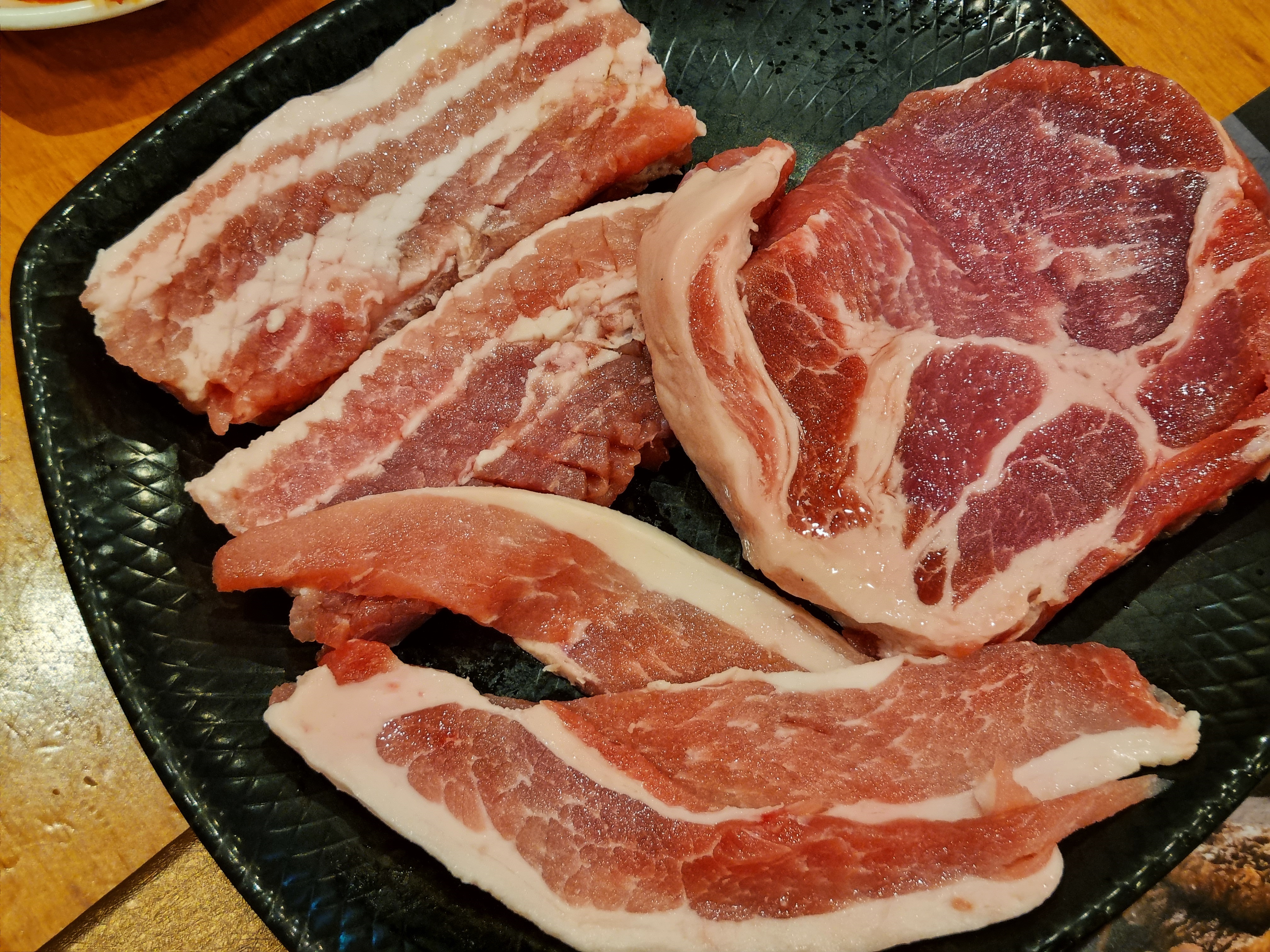 첫 번째로 제공된 숙성 삼겹, 목살, 가브리살을 보니 선홍빛 살코기와 뚜렷한 지방층이 선명하게 구분돼 신선함이 느껴졌어요.