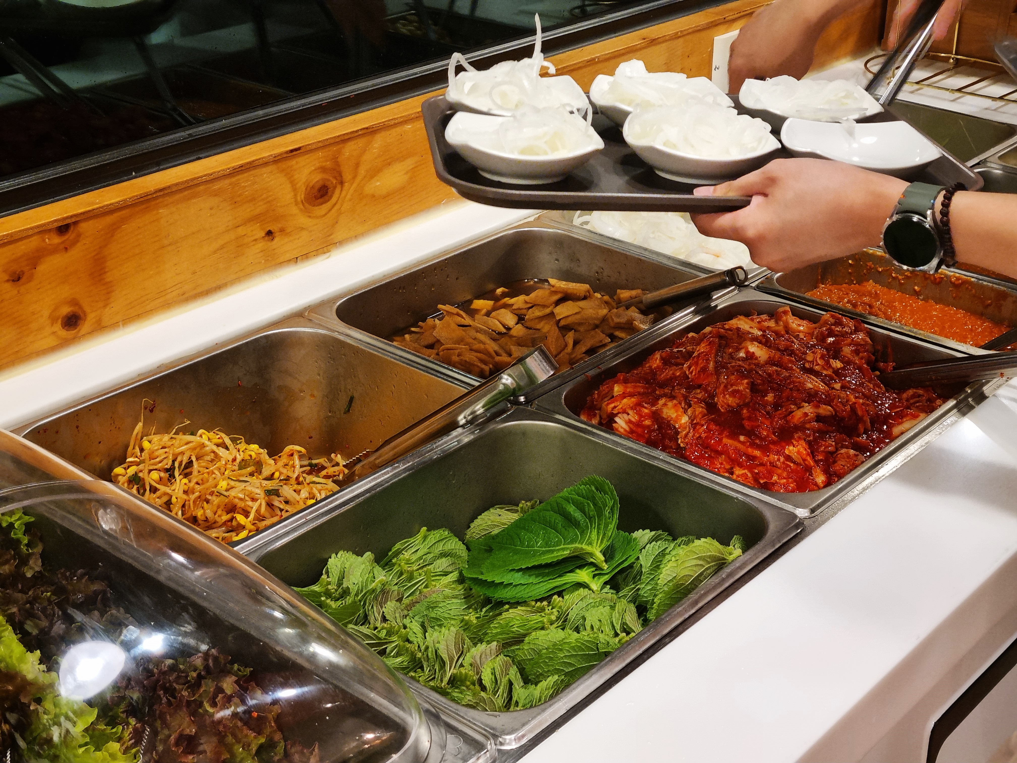 셀프바에는 모닝롤, 잡채, 떡볶이, 튀김류, 소시지, 신선한 야채와 풍성한 소스류까지 다양하게 준비되어 있어서 사이드 메뉴도 정말 알차요. 밥과 음료도 자유롭게 이용할 수 있어 만족도가 높았어요.